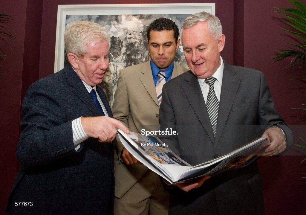 21 November 2011; Uachtarán CLG Criostóir Ó Cuana with Sportsfile photographer Ray McManus, left, alongside Cork hurler and Ulster Bank's Sean Og O'hAilpin, centre, at the launch of 'A Season of Sunday's 2011' sponsored by Ulster Bank. Launch of 'A Season of Sundays 2011', The Croke Park Hotel, Jones' Road, Dublin. Picture credit: Pat Murphy / SPORTSFILE