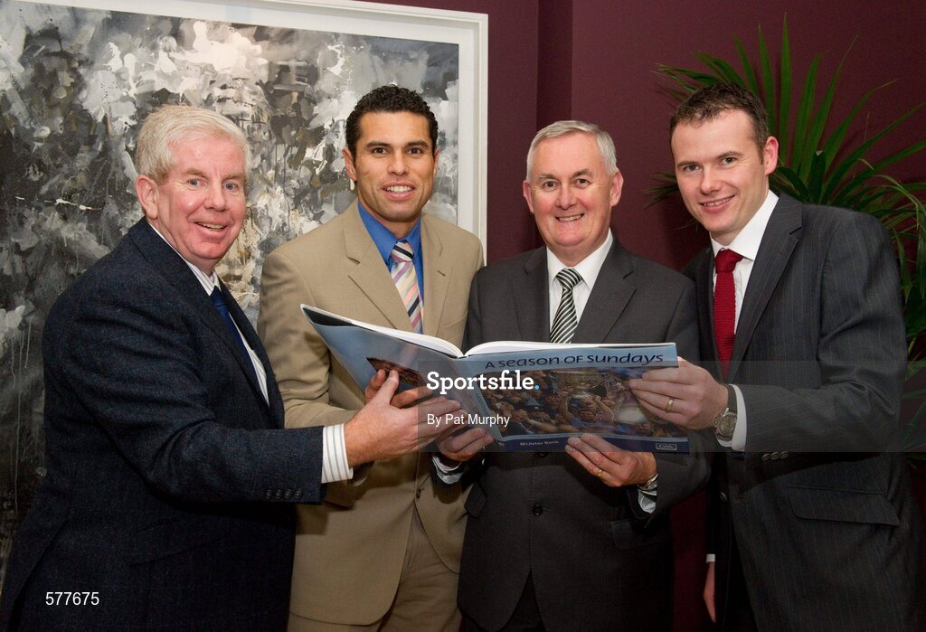 21 November 2011; Uachtarán CLG Criostóir Ó Cuana with, from left, Sportsfile photographer Ray McManus, Cork hurler and Ulster Bank's Sean Og O'hAilpin and GAA Communications Manager Alan Milton at the launch of 'A Season of Sunday's 2011' sponsored by Ulster Bank. Launch of 'A Season of Sundays 2011', The Croke Park Hotel, Jones' Road, Dublin. Picture credit: Pat Murphy / SPORTSFILE