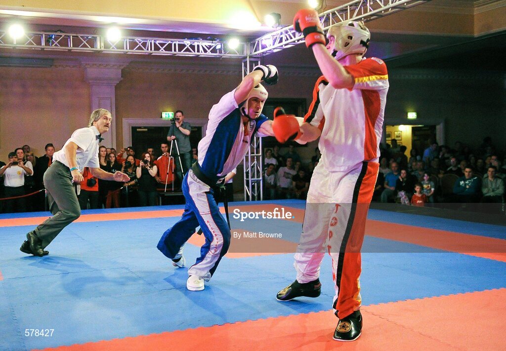 26 November 2011; Drew Neal, right, Kidderminster, England, in action against Alexander Glelxner, Germany, during their 89 kg semi contact bout. 2011 WAKO World Kickboxing Championships, Citywest Conference Centre, Saggart, Dublin. Picture credit: Matt Browne / SPORTSFILE