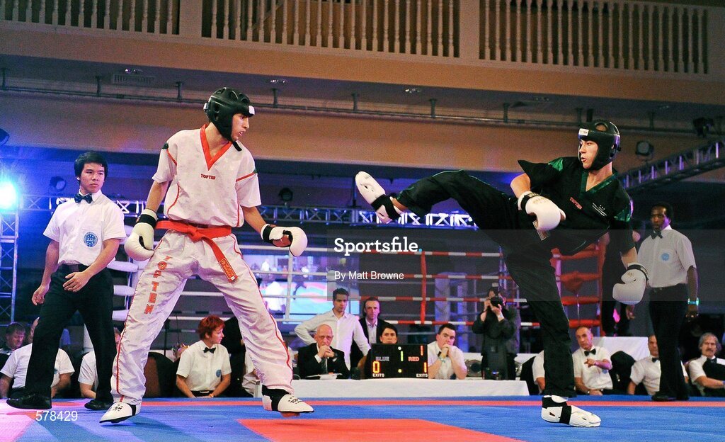 26 November 2011; Ashley St Mart, right, Ireland, in action against the eventual winner Laszlo Varga, Hungary, during their 57 kg semi contact bout. 2011 WAKO World Kickboxing Championships, Citywest Conference Centre, Saggart, Dublin. Picture credit: Matt Browne / SPORTSFILE