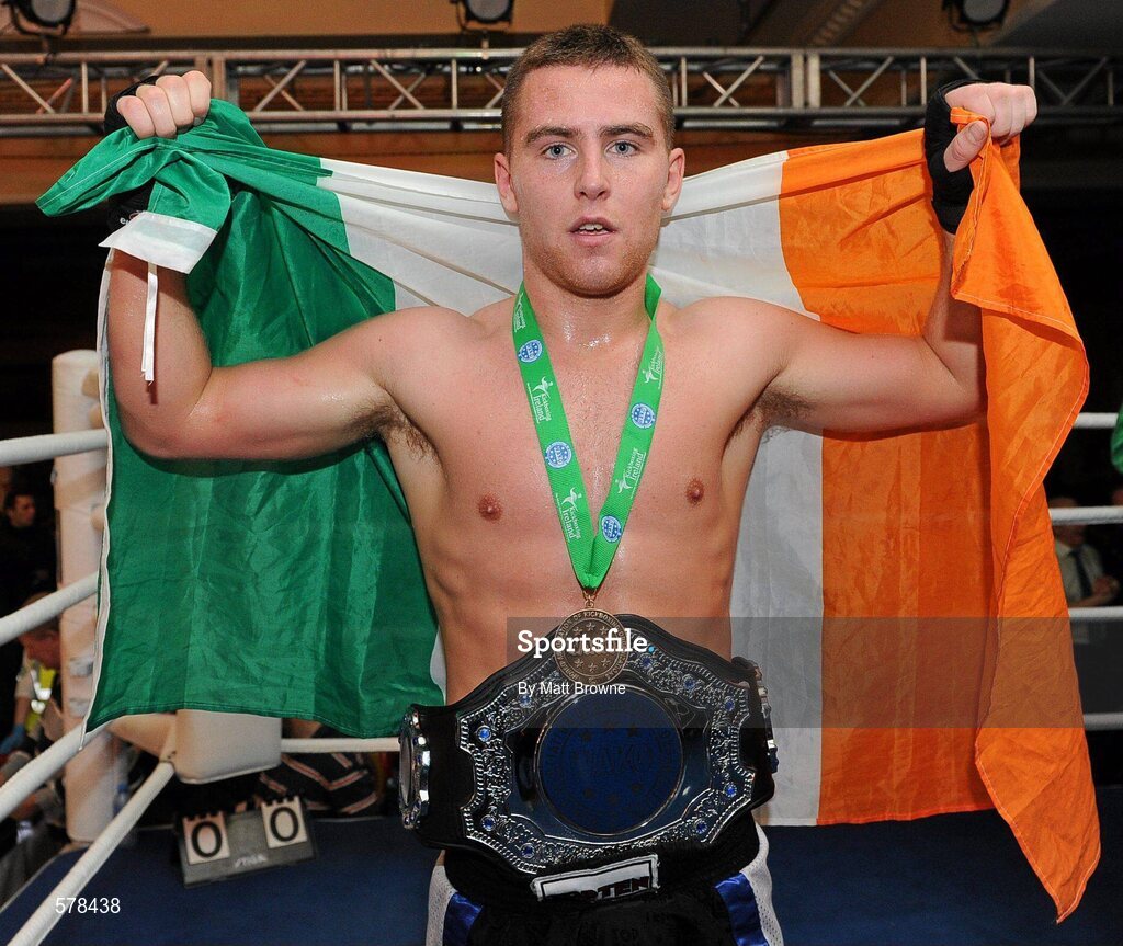 26 November 2011; Brian Brosnan, Galway, celebrates with his gold medal after his win against Stelyan Aveamidi, Kazakhstan, in their 71 kg full contact bout. 2011 WAKO World Kickboxing Championships, Citywest Conference Centre, Saggart, Dublin. Picture credit: Matt Browne / SPORTSFILE