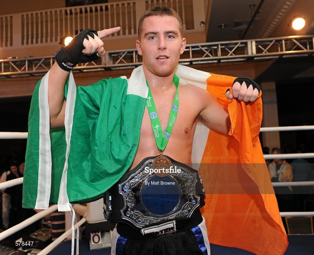 26 November 2011; Brian Brosnan, Galway, celebrates with his gold medal after his win against Stelyan Aveamidi, Kazakhstan, in their 71 kg full contact bout. 2011 WAKO World Kickboxing Championships, Citywest Conference Centre, Saggart, Dublin. Picture credit: Matt Browne / SPORTSFILE