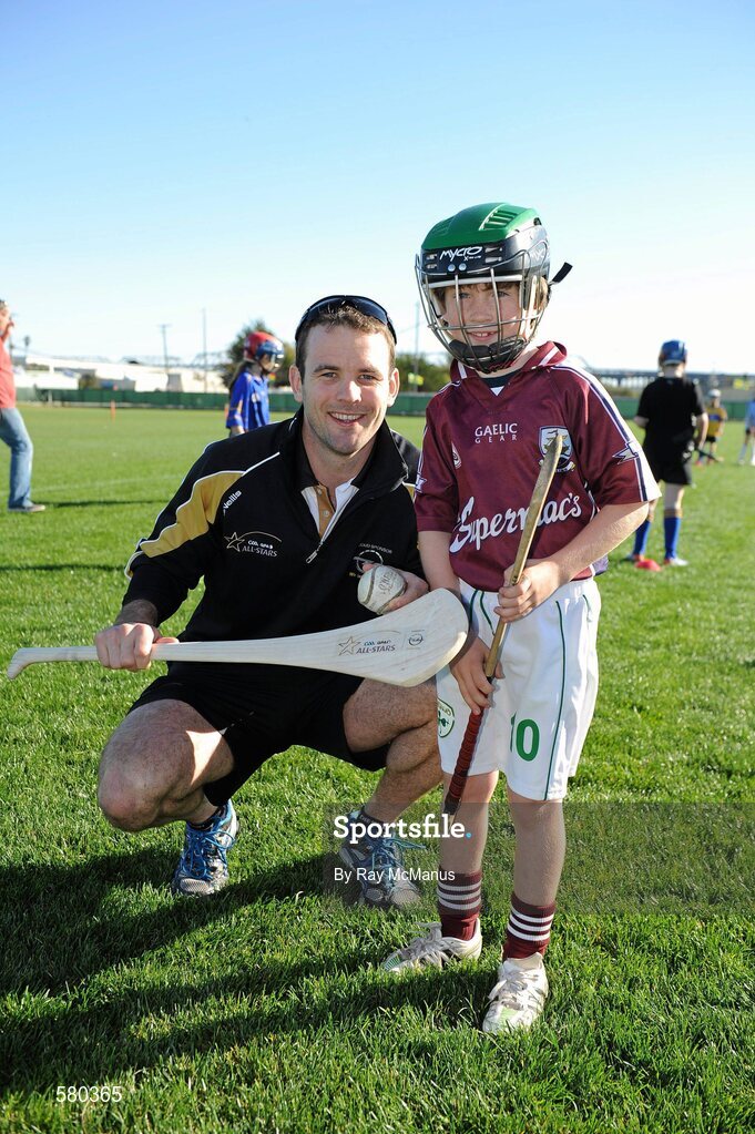 3 December 2011; Galway's David Collins with Keelin Walsh, from the San Francisco GAA Club, during a coaching session organised as part of the tour. Keelin's dad Vivian is from Ballinasloe, Co. Galway. 2011 GAA GPA All-Stars Hurling Tour sponsored by Opel, Treasure Island, San Francisco, California, USA. Picture credit: Ray McManus / SPORTSFILE