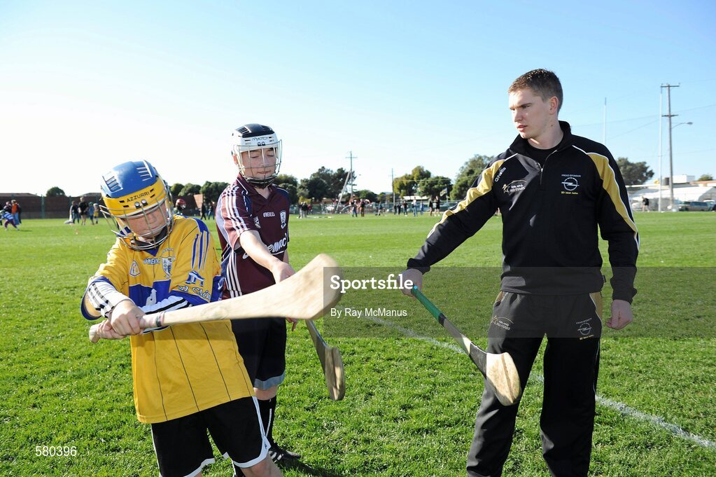 3 December 2011; Brendan Maher, Tipperary, with Conor Casidy, wearing the Clare jersey, and Joseph Howard, Galway, from the San Francisco GAA Club during a coaching session organised as part of the tour. Conor's dad is from Kilfinora, Co. Clare, and Joseph's mother is from Inis Mór, Co. Galway. 2011 GAA GPA All-Stars Hurling Tour sponsored by Opel, Treasure Island, San Francisco, California, USA. Picture credit: Ray McManus / SPORTSFILE
