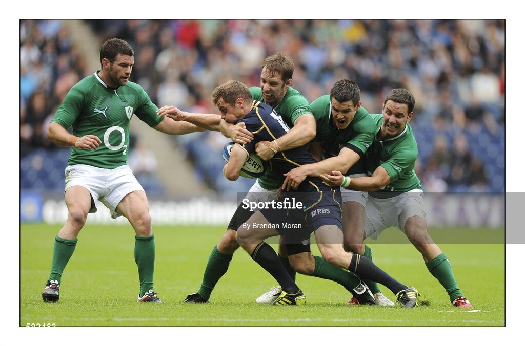 6 August 2011; Chris Paterson, Scotland, is tackled by Ireland's Tomas O'Leary, Jonathan Sexton and Paddy Wallace with Fergus McFadden, left. Rugby World Cup Warm-up Game, Scotland v Ireland, Murrayfield Stadium, Edinburgh, Scotland. Picture credit: Brendan Moran / SPORTSFILE