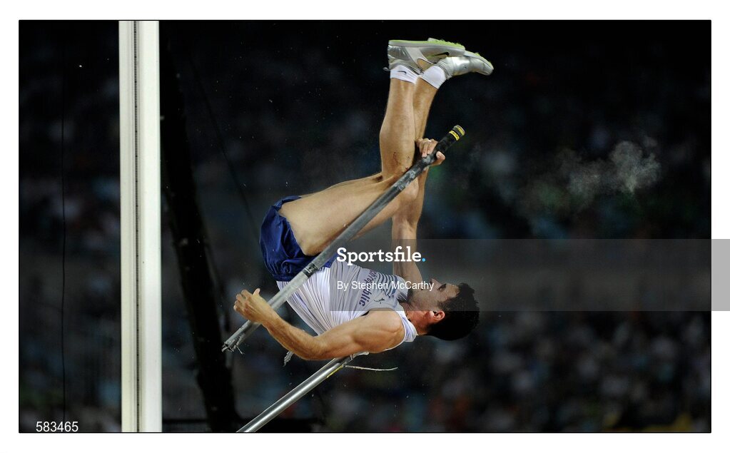 29 August 2011; Jan Kudlicka, Czech Republic, breaks a pole during the Men's Pole Vault Final event. IAAF World Championships - Day 3, Daegu Stadium, Daegu, Korea. Picture credit: Stephen McCarthy / SPORTSFILE