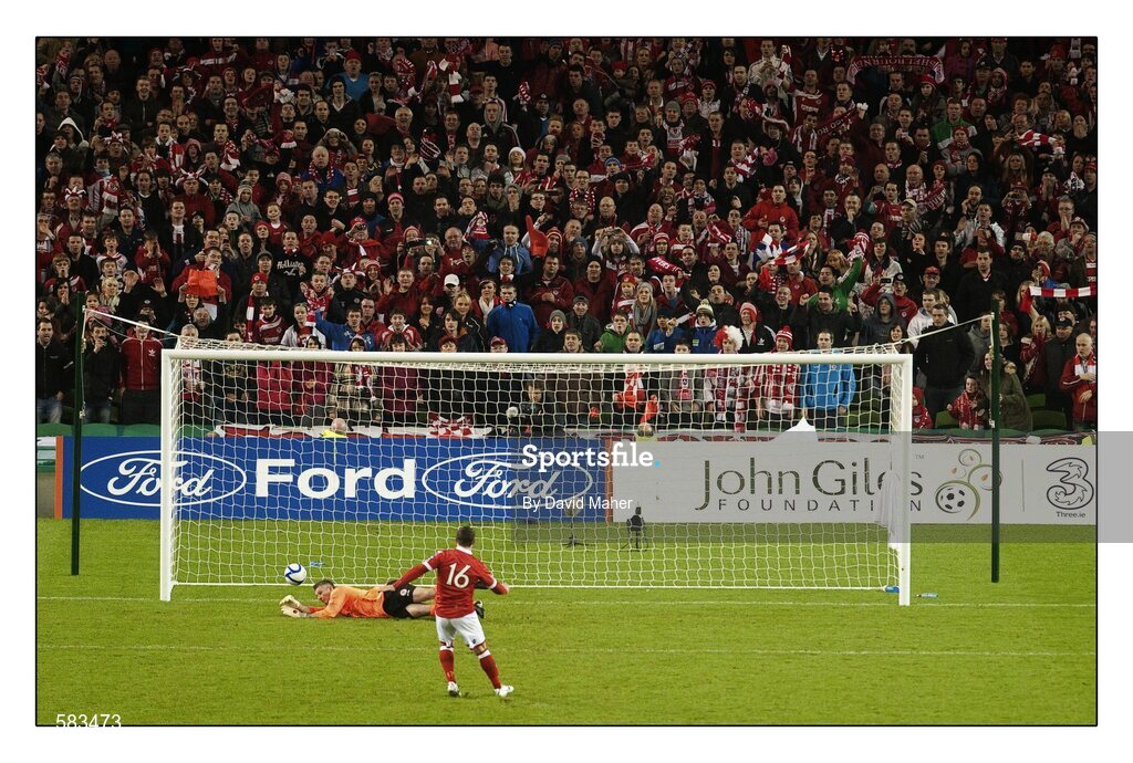 6 November 2011; Sligo Rovers goalkeeper Ciaran Kelly, saves a penalty from Colm James, Shelbourne. FAI Ford Cup Final, Shelbourne v Sligo Rovers, Aviva Stadium, Lansdowne Road, Dublin. Picture credit: David Maher / SPORTSFILE