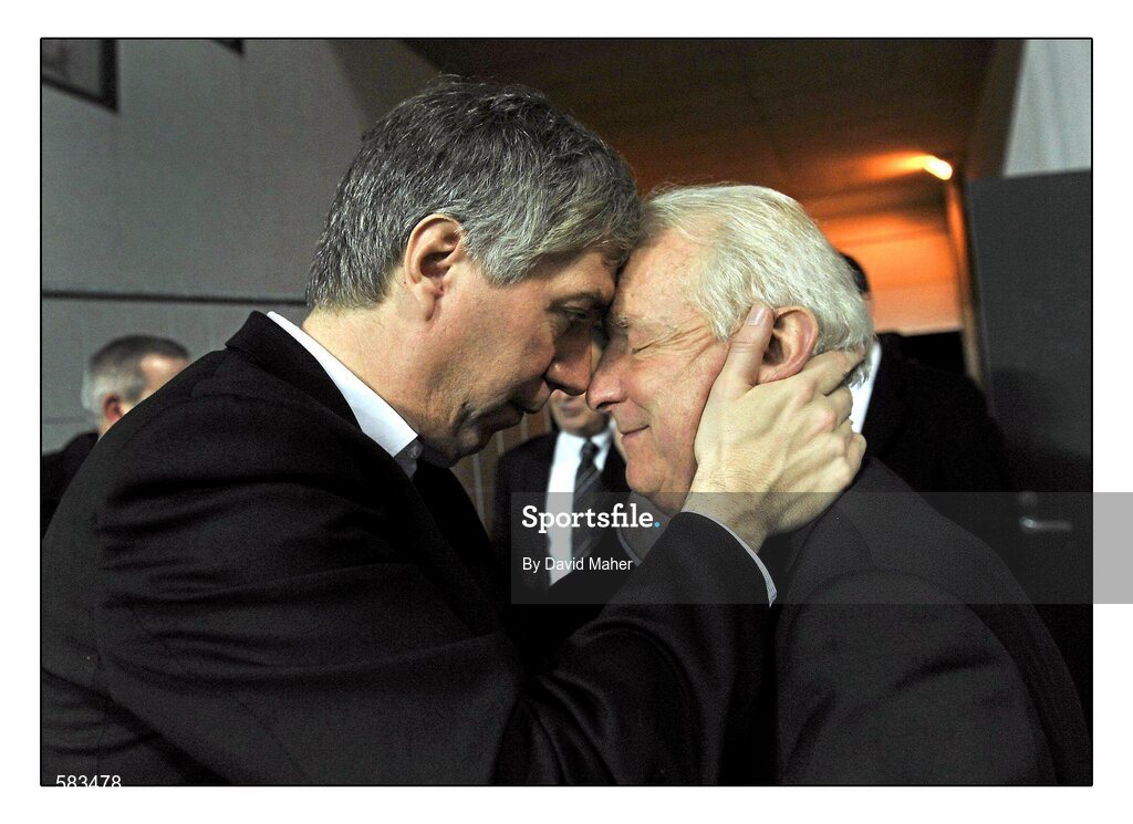 11 November 2011; FAI chief executive John Delaney celebrates with Republic of Ireland manager Giovanni Trapattoni after the game. UEFA EURO2012 Qualifying Play-off, 1st leg, Estonia v Republic of Ireland, Le Coq Arena, Tallinn, Estonia. Picture credit: David Maher / SPORTSFILE