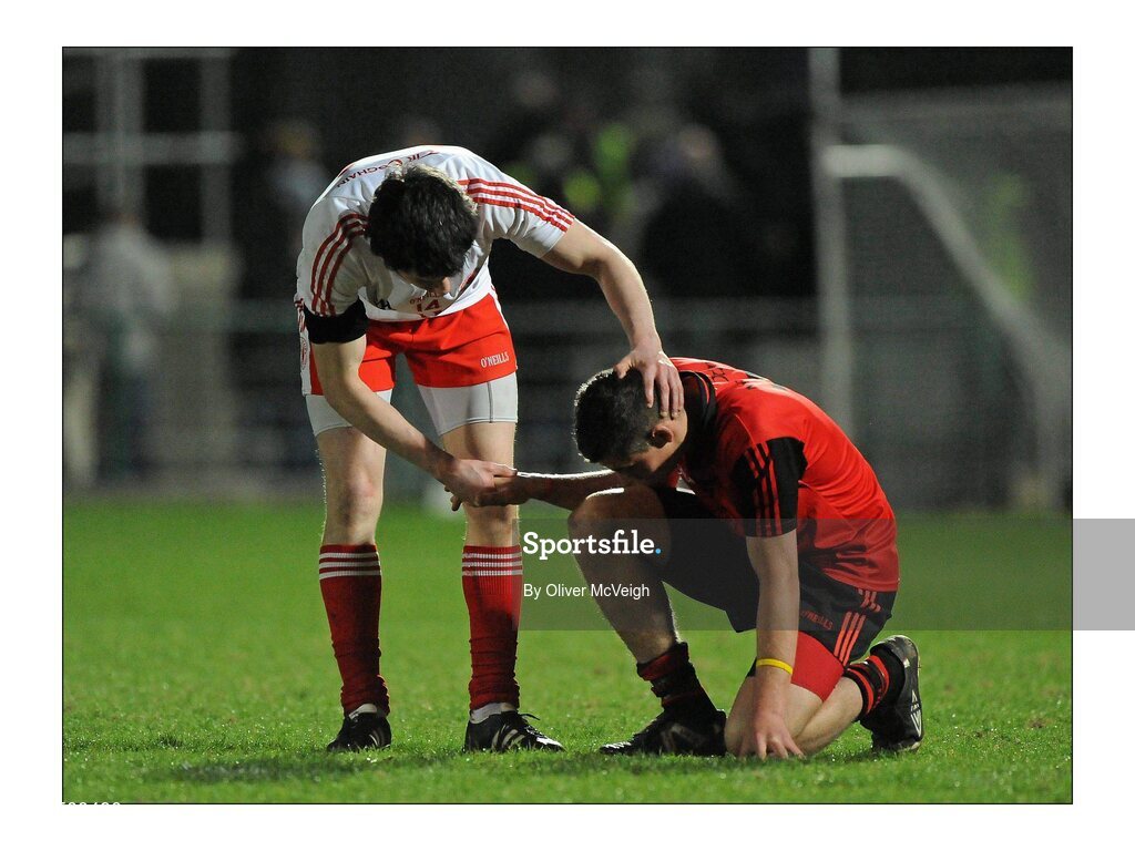 30 March 2011; Matthew Donnelly, Tyrone, left, commiserates with David McKibben, Down, after the final whistle. Cadbury Ulster GAA Football Under 21 Championship Quarter-Final, 2nd Replay, Tyrone v Down, Athletic Grounds, Armagh. Picture credit: Oliver McVeigh / SPORTSFILE