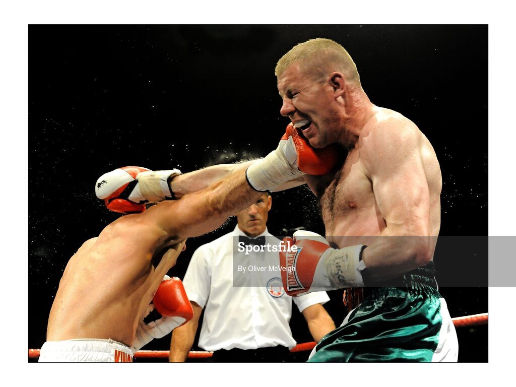 10 September 2011; Eamon O'Kane, left, exchanges punches with Joe Rea during their Middleweight bout. WBA World Light-Welterweight Championship Eliminator, Undercard, Eamon O'Kane v Joe Rea, Odyssey Arena, Belfast, Co. Antrim. Picture credit: Oliver McVeigh / SPORTSFILE