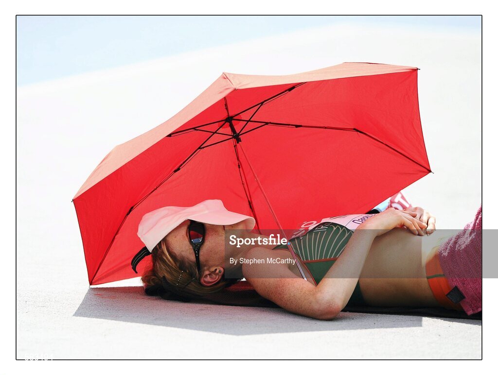 1 September 2011; Deirdre Ryan, Ireland, takes shade from the sun during her qualifying group of the Women's High Jump event. Deirdre cleared the final height of 1.95m to set a new national record and qualify for the final aswell as secure the 'A' qualification standard for the London 2012 Olympic Games. IAAF World Championships - Day 6, Daegu Stadium, Daegu, Korea. Picture credit: Stephen McCarthy / SPORTSFILE