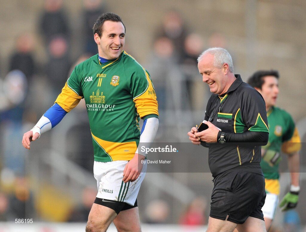 15 January 2012; Graham Reilly, Meath, with referee Sean Carroll, after scoring a point. Bord na Mona O'Byrne Cup, Quarter-Final, Meath v Louth, Pairc Tailteann, Navan, Co. Meath. Picture credit: David Maher / SPORTSFILE