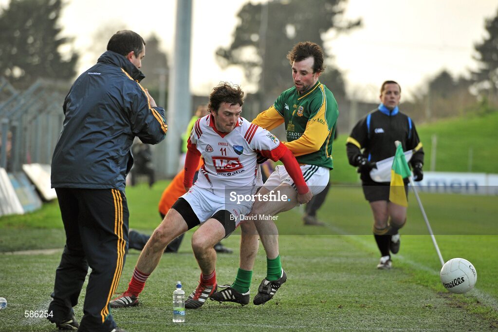 15 January 2012; Derek Crilly, Louth, in action against Shane McAnarney, Meath, as the Meath manager Seamus McEnaney looks on. Bord na Mona O'Byrne Cup, Quarter-Final, Meath v Louth, Pairc Tailteann, Navan, Co. Meath. Picture credit: David Maher / SPORTSFILE