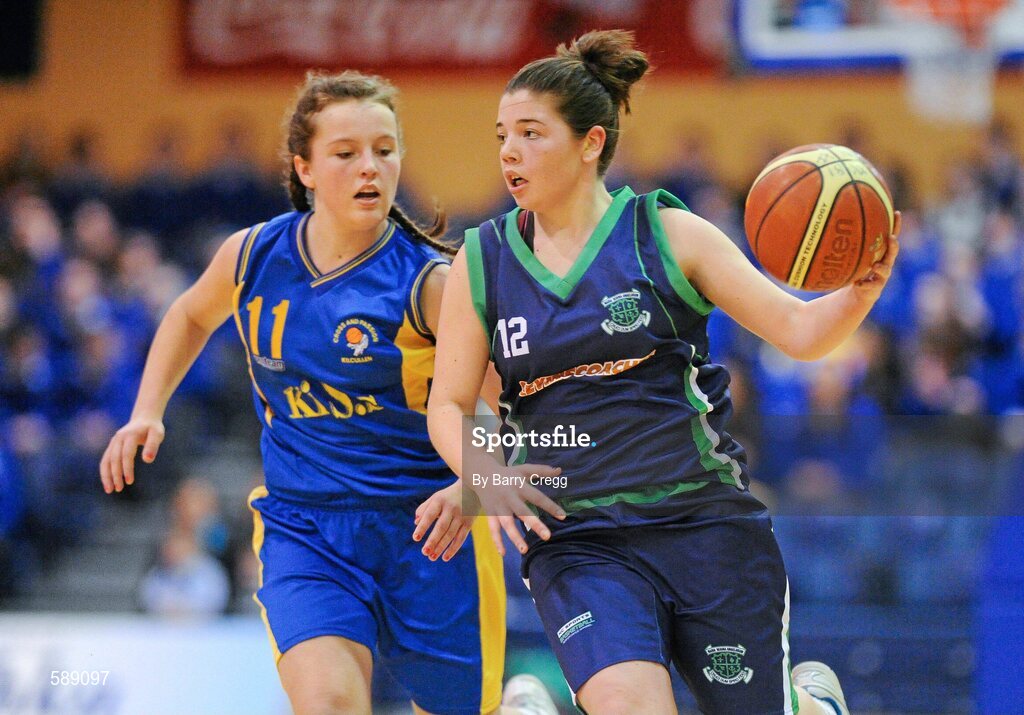 27 January 2012; Bridget Heslin, Loreto Mullingar, in action against Abbie Monaghan, Cross and Passion Kilcullen. All-Ireland Schools Cup U16C Girls Final, Loreto Mullingar, Westmeath v Cross and Passion Kilcullen, Kildare, National Basketball Arena, Tallaght, Dublin. Picture credit: Barry Cregg / SPORTSFILE