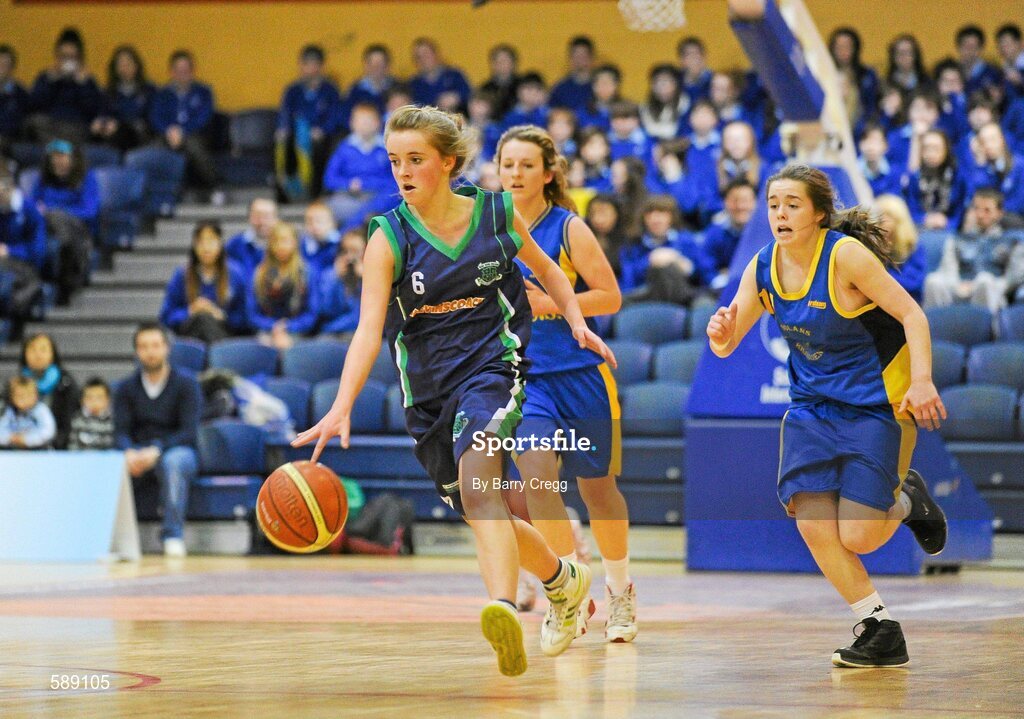 27 January 2012; Jenny Hynes, Loreto Mullingar, in action against Daire Smyth, left, and Ciara Fulham, Cross and Passion Kilcullen. All-Ireland Schools Cup U16C Girls Final, Loreto Mullingar, Westmeath v Cross and Passion Kilcullen, Kildare, National Basketball Arena, Tallaght, Dublin. Picture credit: Barry Cregg / SPORTSFILE