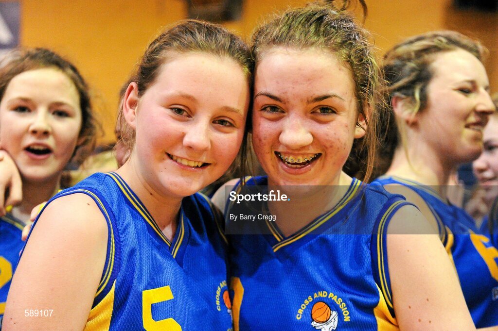 27 January 2012; Katie Willis, left, and Emma Wheeler, Cross and Passion Kilcullen, celebrate after the game. All-Ireland Schools Cup U16C Girls Final, Loreto Mullingar, Westmeath v Cross and Passion Kilcullen, Kildare, National Basketball Arena, Tallaght, Dublin. Picture credit: Barry Cregg / SPORTSFILE