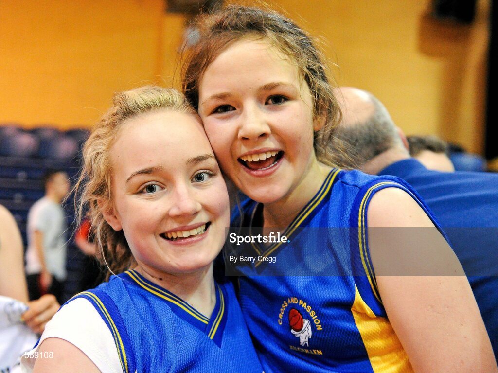 27 January 2012; Janet Coogan, left, and Deirdre Conway, Cross and Passion Kilcullen, celebrate after the game. All-Ireland Schools Cup U16C Girls Final, Loreto Mullingar, Westmeath v Cross and Passion Kilcullen, Kildare, National Basketball Arena, Tallaght, Dublin. Picture credit: Barry Cregg / SPORTSFILE