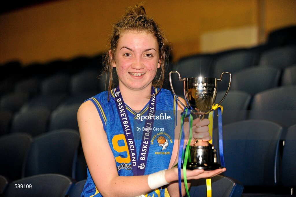 27 January 2012; Cross and Passion Kilcullen captain Emma Wheeler with the cup after the game. All-Ireland Schools Cup U16C Girls Final, Loreto Mullingar, Westmeath v Cross and Passion Kilcullen, Kildare, National Basketball Arena, Tallaght, Dublin. Picture credit: Barry Cregg / SPORTSFILE