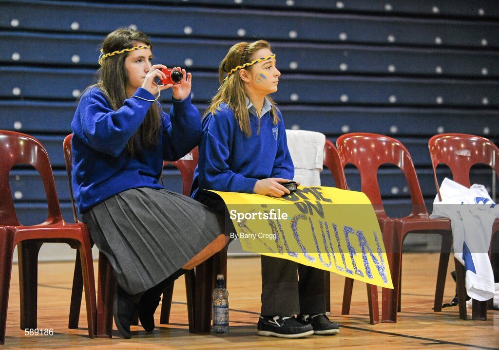 27 January 2012; Cross and Passion Kilcullen, Kildare, supporters Kerry Mockler, left, age 14, and Cliona O'Connor, right, age 13, both from Kilcullen, Co. Kildare. All-Ireland Schools Cup U16C Girls Final, Loreto Mullingar, Westmeath v Cross and Passion Kilcullen, Kildare, National Basketball Arena, Tallaght, Dublin. Picture credit: Barry Cregg / SPORTSFILE