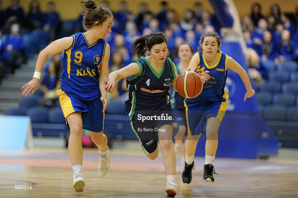 27 January 2012; Sabina McLoughlin, Loreto Mullingar, Westmeath, in action against Emma Wheeler, left, and Elaine Marron, right, Cross and Passion Kilcullen, Kildare. All-Ireland Schools Cup U16C Girls Final, Loreto Mullingar, Westmeath v Cross and Passion Kilcullen, Kildare, National Basketball Arena, Tallaght, Dublin. Picture credit: Barry Cregg / SPORTSFILE