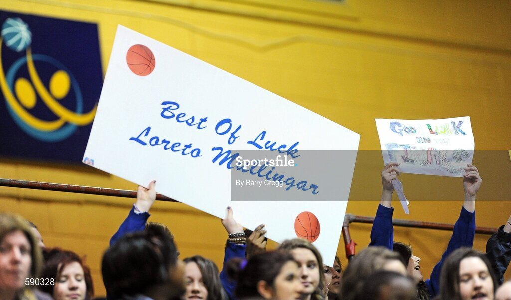 27 January 2012; Loreto Mullingar, Westmeath, supporters show their support for their team during the game. All-Ireland Schools Cup U16C Girls Final, Loreto Mullingar, Westmeath v Cross and Passion Kilcullen, Kildare, National Basketball Arena, Tallaght, Dublin. Picture credit: Barry Cregg / SPORTSFILE