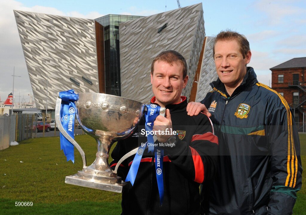 1 February 2012; Down manager James McCartan, left, and Meath selector and player Graham Geraghty pictured at the Titanic Building, Titanic Quarter, at the Belfast launch of the 2012 Allianz Football Leagues, Belfast, Co. Antrim. Picture credit: Oliver McVeigh / SPORTSFILE