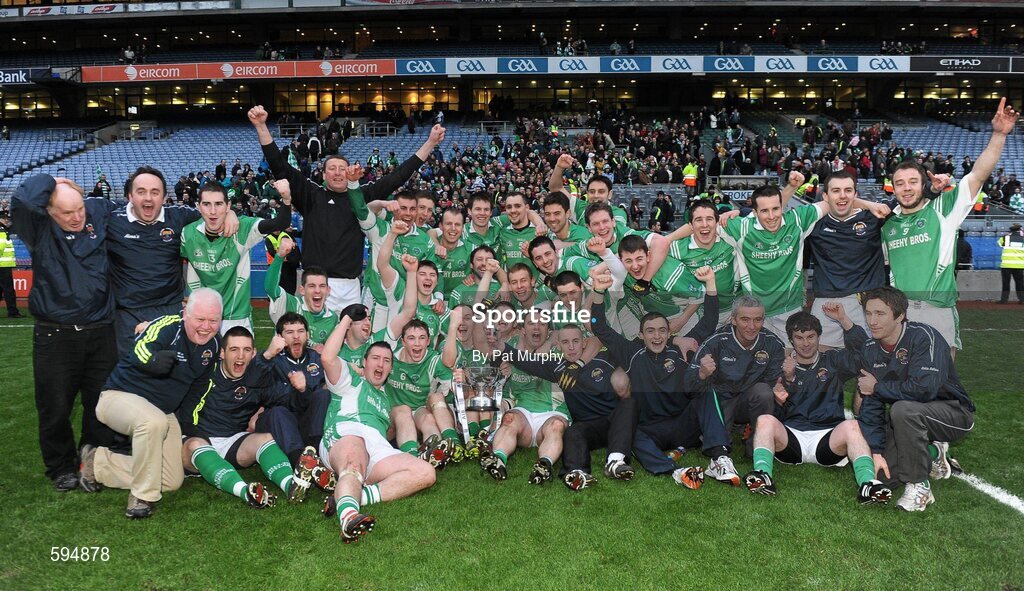 12 February 2012; The Milltown - Castlemaine team celebrate with the cup after the game. AIB GAA Football All-Ireland Intermediate Club Championship Final, Davitts, Mayo v Milltown - Castlemaine, Co. Kerry, Croke Park, Dublin. Picture credit: Pat Murphy / SPORTSFILE