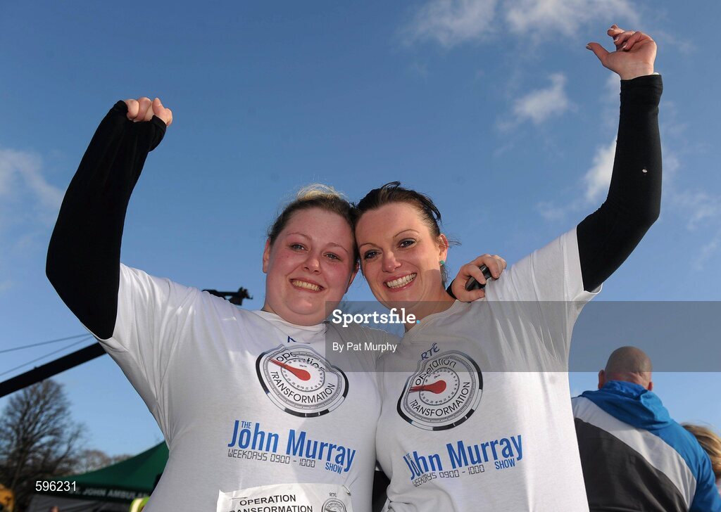 18 February 2012; Operation Transformation team members Natalie Cox, from Crumlin, Dublin, left, and Grace Batterberry, from Castletownroche, Cork, celebrate after finishing the Operation Transformation Race 2012. Phoenix Park, Dublin. Picture credit: Pat Murphy / SPORTSFILE