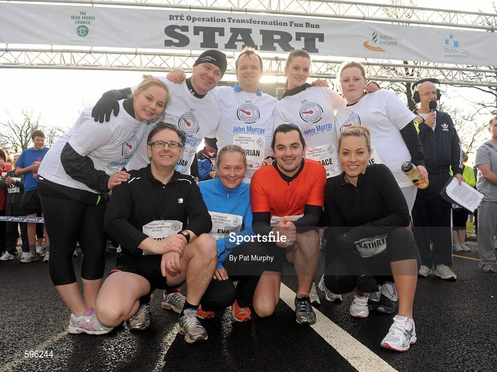 18 February 2012; The Operation Transformation team, back row from left; Kayleigh Yeoman, from Corbally, Limerick, Adrian Brereton, from Edenderry, Co. Offaly, Killian Byrne, from Rathfarnham, Dublin, Grace Batterberry, from Castletownroche, Co. Cork, and Natalie Cox, from Crumlin, Dublin. Front row, from left; Dr. Eddie Murphy, Dr. Eva Orsmond, Karl Henry and Kathryn Thomas, RTE Presenter, before the start of the Operation Transformation Race 2012. Phoenix Park, Dublin. Picture credit: Pat Murphy / SPORTSFILE