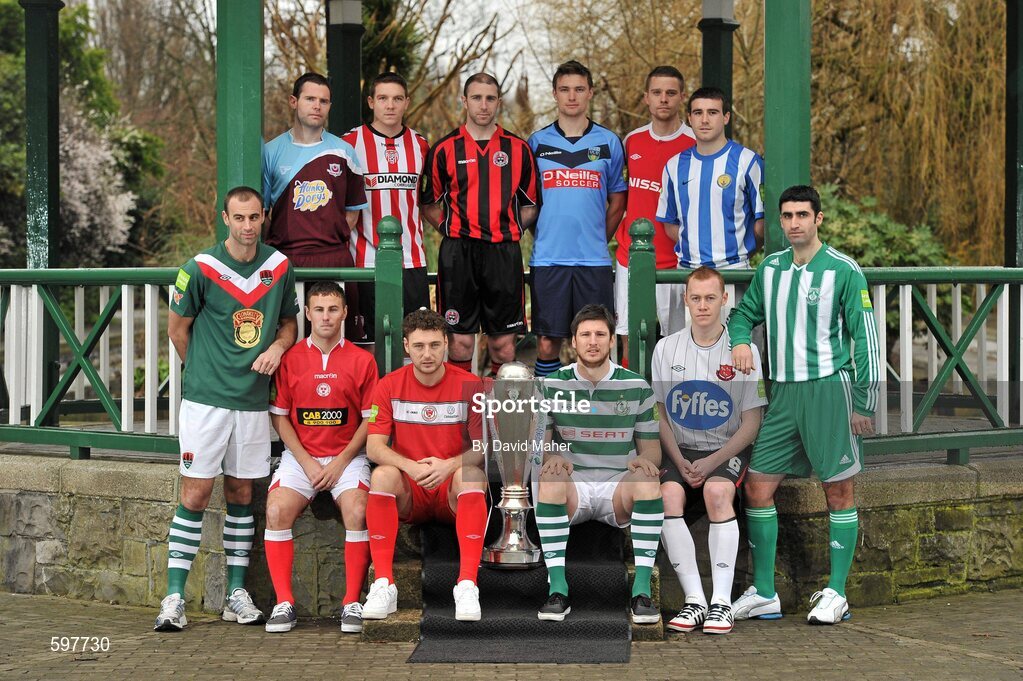 24 February 2012; In attendance at the Airtricity League 2012 launch are players standing, left to right, Dan Murray, Cork City, Paul Crowley, Drogheda United, Kevin Deery, Derry City, Mick Leahy, UCD, Ger O'Brien, St. Patrick's Athletic, Robert Bayly, Monaghan United and Danny O'Connor, Bray Wanderers, front row, sitting left to right, David Cassidy, Shelbourne, Mark Quigley, Sligo Rovers, Ken Oman, Shamrock Rovers and Chris Shields, Dundalk. Airtricity League 2012 Launch, The Herbert Park Hotel, Ballsbridge, Dublin. Picture credit: David Maher / SPORTSFILE