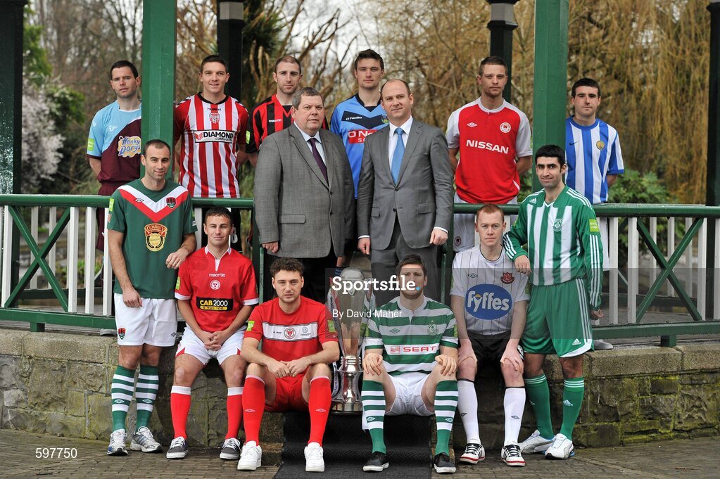 24 February 2012; In attendance at the Airtricity League 2012 launch is Stephen Wheeler, centre right, Managing Director, Airtricty, and Eamon Naughton, Chairman of the Airtricity League with players standing, left to right, Paul Crowley, Drogheda United, Dan Murray, Cork City, Kevin Deery, Derry City, Mick Leahy, UCD, Ger O'Brien, St. Patrick's Athletic, Robert Bayly, Monaghan United and Danny O'Connor, Bray Wanderers, front row, sitting left to right, David Cassidy, Shelbourne, Mark Quigley, Sligo Rovers, Ken Oman, Shamrock Rovers and Chris Shields, Dundalk. Airtricity League 2012 Launch, The Herbert Park Hotel, Ballsbridge, Dublin. Picture credit: David Maher / SPORTSFILE