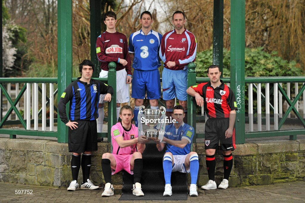 24 February 2012; In attendance at the Airtricity League 2012 launch are players, standing left to right, Scott Gaynor, Athlone Town, Sean Buckley, Salthill Devon, Galway, David Breen, Waterford United, Damien O'Rourke, Mervue united, and Colly James, Longford Town, with front row, Danny Furlong, left, Wexford Youths, and Stephen Bradley, Limerick FC. Airtricity League 2012 Launch, The Herbert Park Hotel, Ballsbridge, Dublin. Picture credit: David Maher / SPORTSFILE