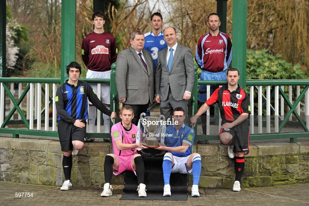 24 February 2012; In attendance at the Airtricity League 2012 launch is Stephen Wheeler, 3rd from right, Managing Director, Airtricty, and Eamon Naughton, Chairman of the Airtricty League, with players, standing left to right, Scott Gaynor, Athlone Town, Sean Buckley, Salthill Devon, Galway, David Breen, Waterford United, Damien O'Rourke, Mervue United, and Colly James, Longford Town, with front row, Danny Furlong, left, Wexford Youths, and Stephen Bradley, Limerick FC. Airtricity League 2012 Launch, The Herbert Park Hotel, Ballsbridge, Dublin. Picture credit: David Maher / SPORTSFILE