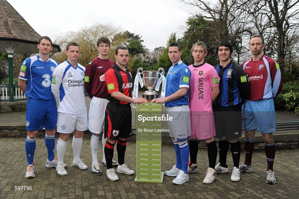 24 February 2012; In attendance at the Airtricity League 2012 launch are, from left, David Breen, Waterford United, Kevin McHugh, Finn Harps, Sean Buckley, Salthill Devon, Colly James, Longford Town, Stephen Bradley, Limerick FC, Danny Furlong, Wexford Youths, Scott Gaynor, Athlone Town, and Damien O'Rourke, Mervue United. Airtricity League 2012 Launch, The Herbert Park Hotel, Ballsbridge, Dublin. Picture credit: Brian Lawless / SPORTSFILE