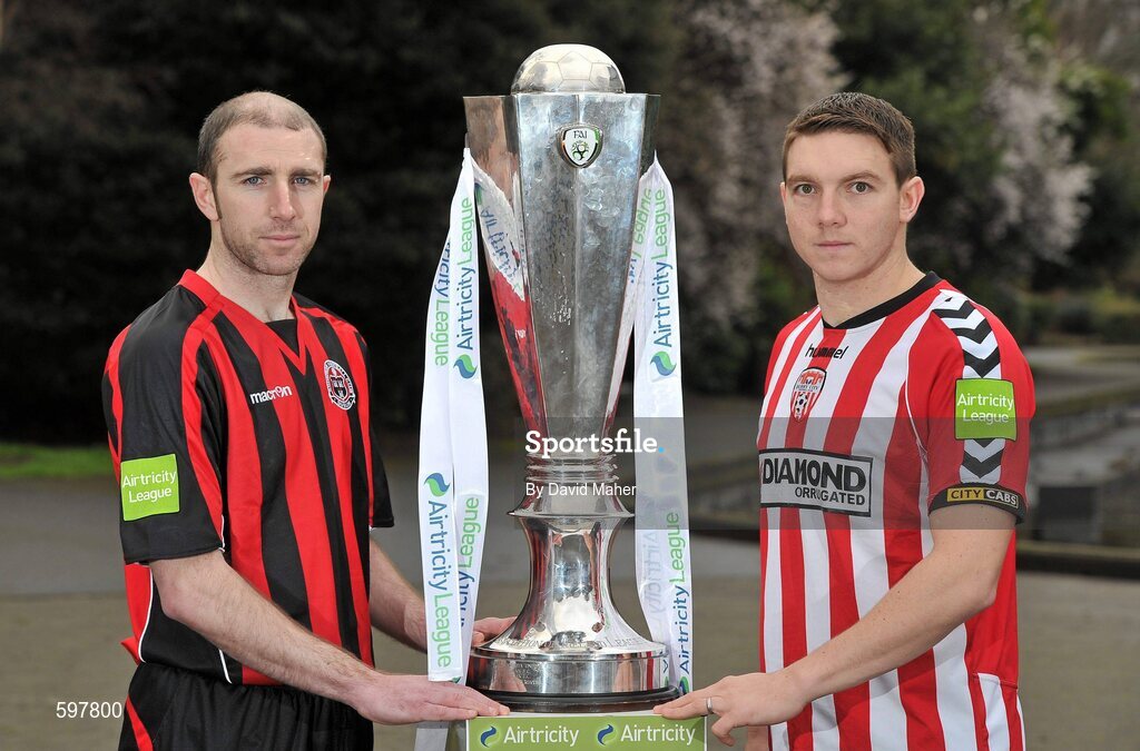 27 February 2012; In attendance at the Airtricity League 2012 launch is Owen Heary, Bohemians, left, and Kevin Deery, Derry City, both teams will face each other during the opening weekend of the Airtricity League Premier Division. Airtricity League 2012 Launch, The Herbert Park Hotel, Ballsbridge, Dublin. Picture credit: David Maher / SPORTSFILE