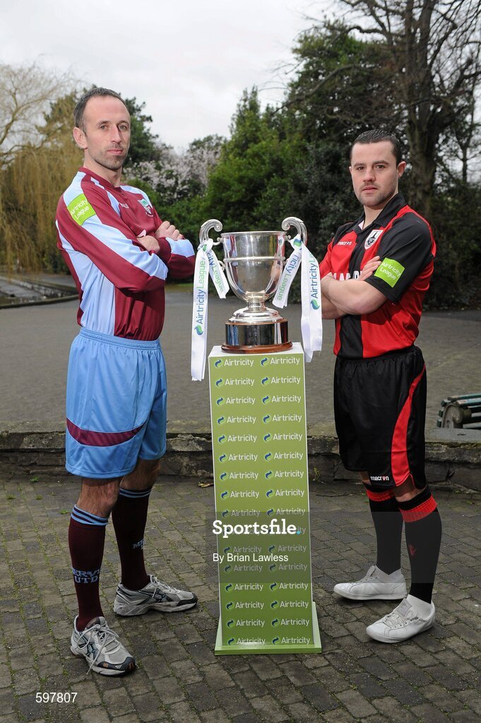 27 February 2012; In attendance at the Airtricity League 2012 launch are Damien O'Rourke, Mervue United, left, and Colly James, Longford Town, both teams will face each other during the opening weekend of the Airtricity League First Division. Airtricity League 2012 Launch, The Herbert Park Hotel, Ballsbridge, Dublin. Picture credit: Brian Lawless / SPORTSFILE