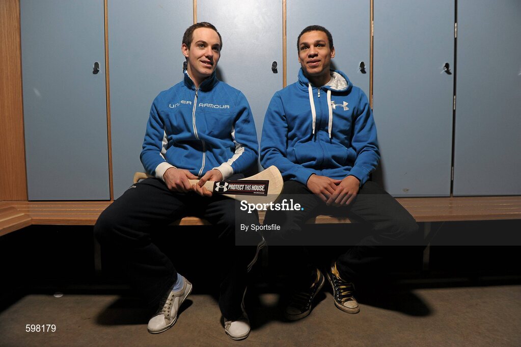 28 February 2012; Under Armour has renewed its partnership with the Dublin senior football and hurling teams for 2012 and will once again be the official performance base layer partner for both teams in the League and Championship. At today’s announcement was Dublin footballer Craig Dias and Dublin hurler Tomás Brady, left. St Clare's DCU, Glasnevin, Dublin. Photo by Sportsfile