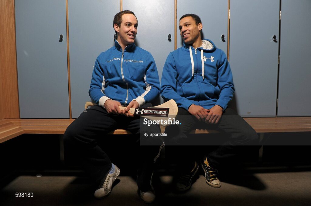 28 February 2012; Under Armour has renewed its partnership with the Dublin senior football and hurling teams for 2012 and will once again be the official performance base layer partner for both teams in the League and Championship. At today’s announcement was Dublin footballer Craig Dias and Dublin hurler Tomás Brady, left. St Clare's DCU, Glasnevin, Dublin. Photo by Sportsfile