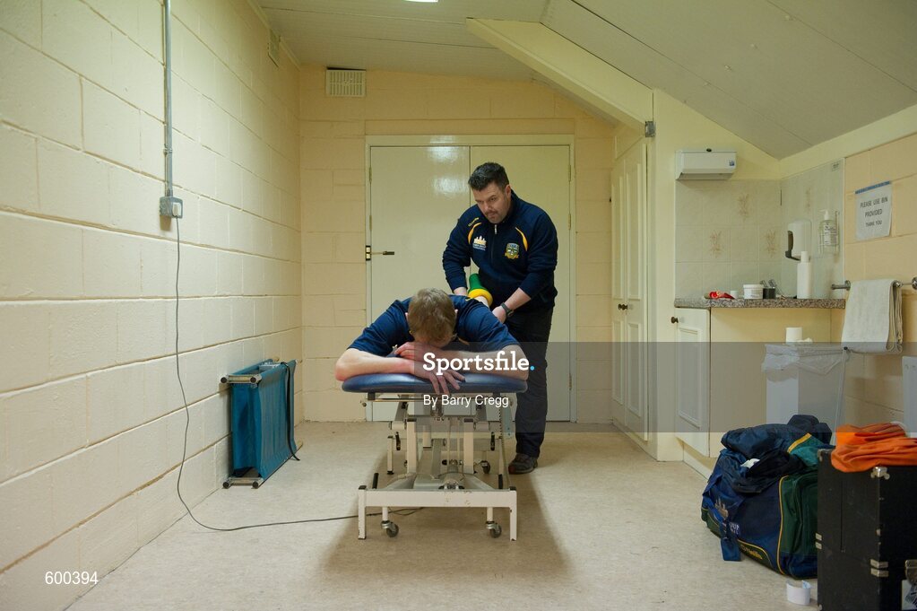 3 March 2012; Graham Geraghty, Meath, receives treatment from team physiotherapist Gerry Nolan before the game. Allianz Football League, Division 2, Round 3, Meath v Kildare, Páirc Táilteann, Navan, Co. Meath. Picture credit: Barry Cregg / SPORTSFILE