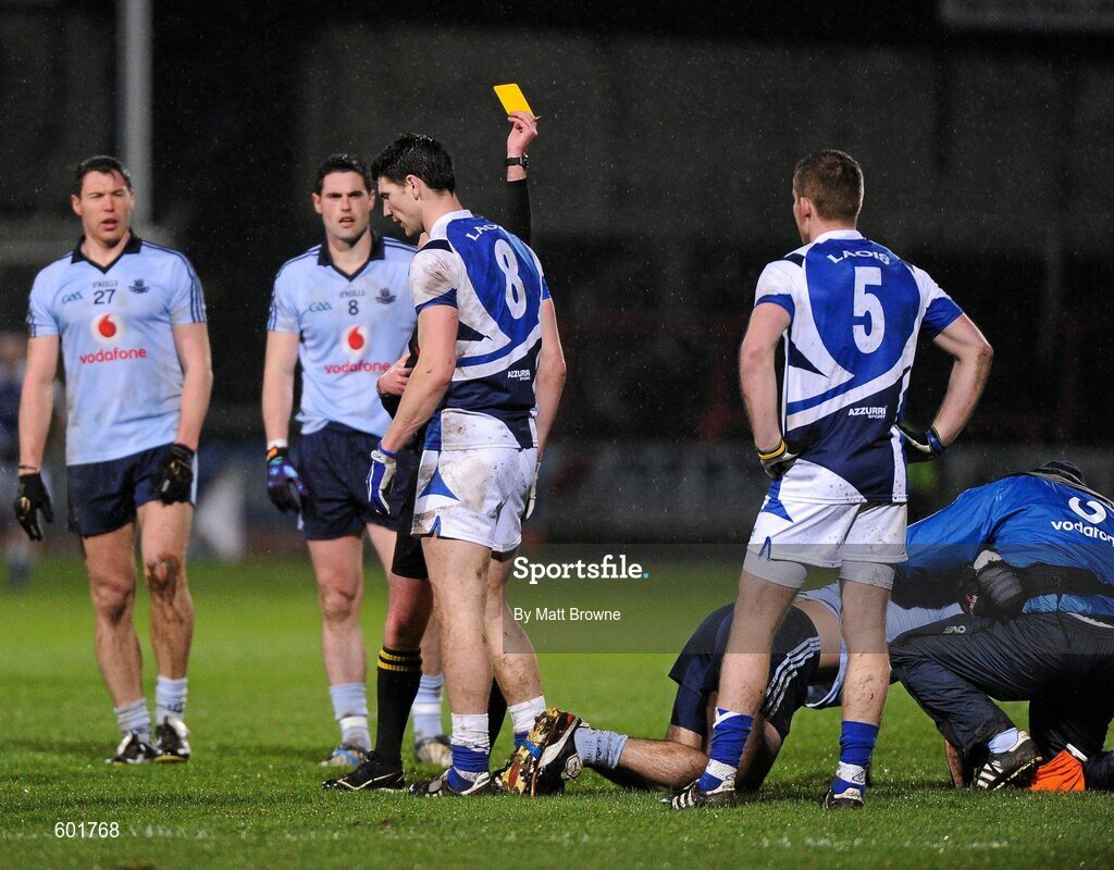 3 March 2012; Referee David Coldrick issues a yellow card to Laois' Brendan Quigley, 8. Allianz Football League, Division 1, Laois v Dublin, O'Moore Park, Portlaoise, Co. Laois. Picture credit: Matt Browne / SPORTSFILE