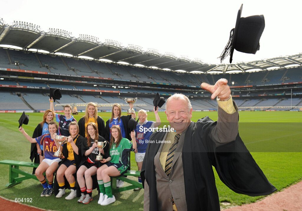 20 March 2012; In attendance at the launch of the Ladies Gaelic Football 3rd Level Colleges Championship Weekend, which takes place on the 24th and 25th of March in Queens University Belfast, are, Pat Quill, President of the Ladies Gaelic Football Association, with back row, from left; Sinead McCoy, University of Ulster Jordanstown, Amy Foley, Tralee IT, Grainne McGlade, NUI Maynooth, Bridin Doyle, WIT, and Donna Berry, WIT. Front row, from left; Orla Heavey, UL, Ellen McCarron, DCU, Sinead O'Sullivan, Trinity College, and Nora Ward, AIT. Croke Park, Dublin. Picture credit: Brian Lawless / SPORTSFILE