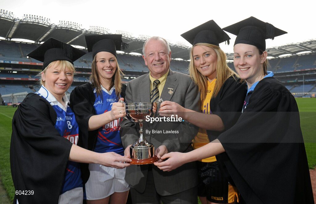 20 March 2012; In attendance at the launch of the Ladies Gaelic Football 3rd Level Colleges Championship Weekend, which takes place on the 24th and 25th of March in Queens University Belfast, are, Pat Quill, President of the Ladies Gaelic Football Association, with, from left; Donna Berry and Bridin Doyle, WIT, Grainne McGlade, NUI Maynooth, and Amy Foley, Tralee IT. Croke Park, Dublin. Picture credit: Brian Lawless / SPORTSFILE