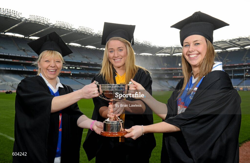 20 March 2012; In attendance at the launch of the Ladies Gaelic Football 3rd Level Colleges Championship Weekend, which takes place on the 24th and 25th of March in Queens University Belfast, are WIT's Donna Berry, left, and Bridin Doyle, right, with Grainne McGlade, NUI Maynooth, centre. Croke Park, Dublin. Picture credit: Brian Lawless / SPORTSFILE