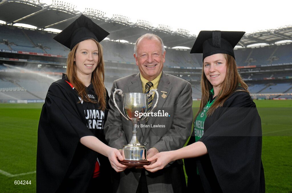 20 March 2012; In attendance at the launch of the Ladies Gaelic Football 3rd Level Colleges Championship Weekend, which takes place on the 24th and 25th of March in Queens University Belfast, are Pat Quill, President of the Ladies Gaelic Football Association, with Sinead O'Sullivan, Trinity College, left, and Nora Ward, AIT. Croke Park, Dublin. Picture credit: Brian Lawless / SPORTSFILE