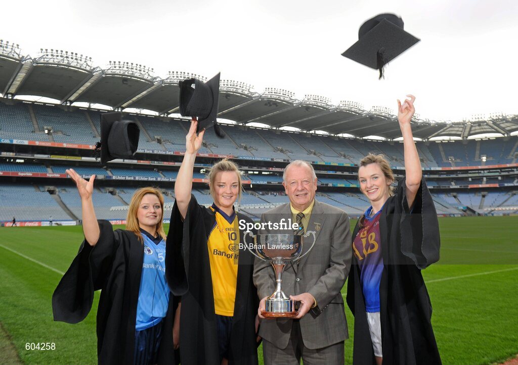 20 March 2012; In attendance at the launch of the Ladies Gaelic Football 3rd Level Colleges Championship Weekend, which takes place on the 24th and 25th of March in Queens University Belfast, are Pat Quill, President of the Ladies Gaelic Football Association, with from left, Sinead McCoy, University of Ulster Jordanstown, Ellen McCarron, DCU, and Orla Heavey, UL. Croke Park, Dublin. Picture credit: Brian Lawless / SPORTSFILE