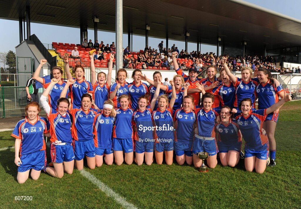 25 March 2012; Mary Immaculate College players celebrate with the Giles cup. Giles Cup Final, Mary Immaculate College Limerick v NUI Maynooth, Queen's University Belfast, University Road, Belfast. Picture credit: Oliver McVeigh / SPORTSFILE