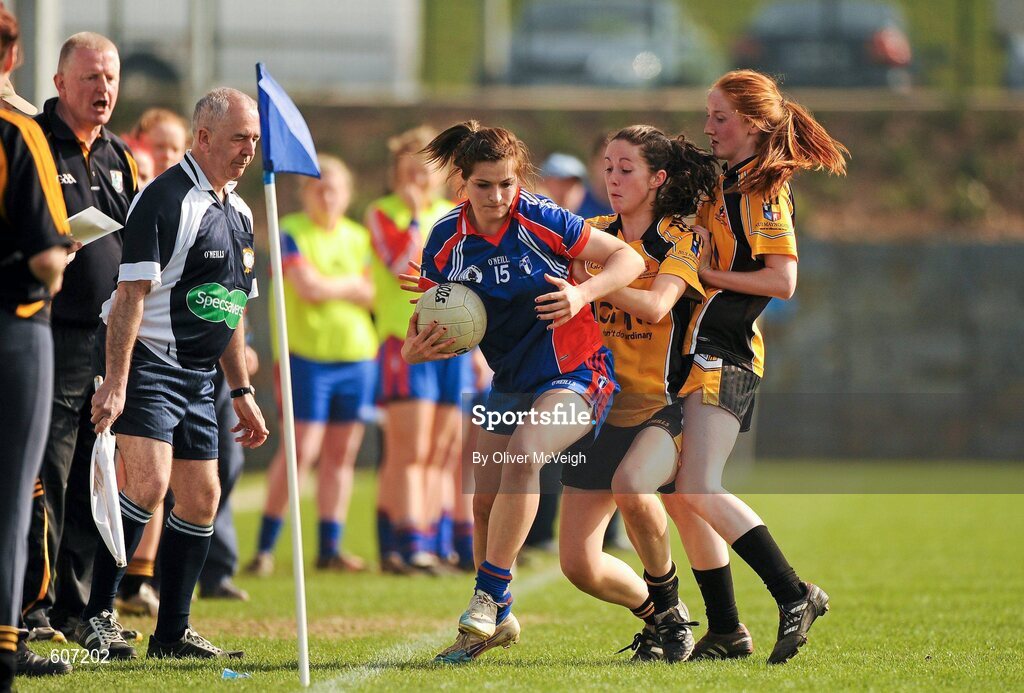 25 March 2012; Sarah Harrington, Mary Immaculate College Limerick, in action against Grainne McGlade and Aoife O'Reilly, right, NUI Maynooth. Giles Cup Final, Mary Immaculate College Limerick v NUI Maynooth, Queen's University Belfast, University Road, Belfast. Picture credit: Oliver McVeigh / SPORTSFILE