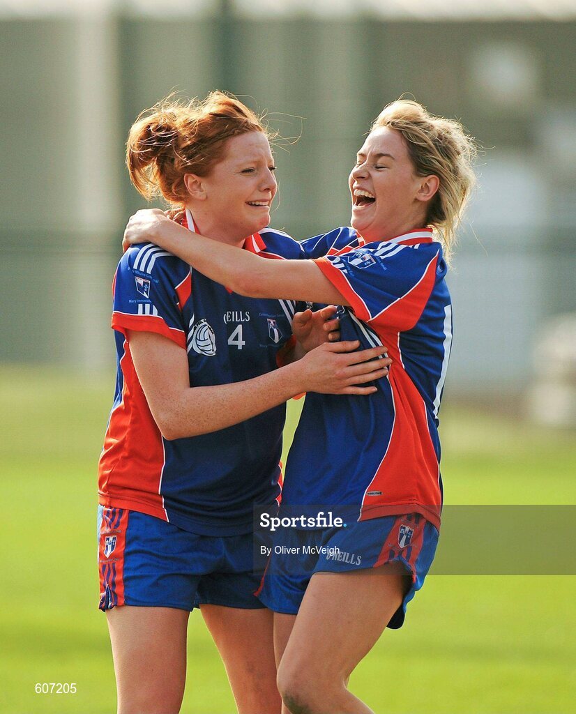 25 March 2012; Patricia Dunne and Orla Finn, right, Mary Immaculate College Limerick, celebrate after the final whistle. Giles Cup Final, Mary Immaculate College Limerick v NUI Maynooth, Queen's University Belfast, University Road, Belfast. Picture credit: Oliver McVeigh / SPORTSFILE