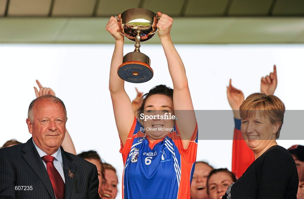 25 March 2012; Niamh NiChaoimh, Mary Immaculate College Limerick, holds aloft the Giles cup, as Pat Quill, President of the Ladies Gaelic Football Association, right, and Former President of the Ladies Gaelic Football Association Geraldine Giles look on. Giles Cup Final, Mary Immaculate College Limerick v NUI Maynooth, Queen's University Belfast, University Road, Belfast. Picture credit: Oliver McVeigh / SPORTSFILE