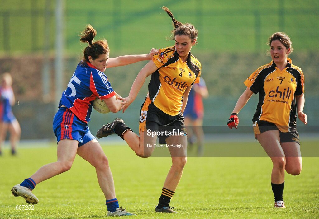 25 March 2012; Sarah Harrington, Mary Immaculate College, in action against Sinead Kenny, NUI Maynooth. Giles Cup Final, Mary Immaculate College Limerick v NUI Maynooth, Queen's University Belfast, University Road, Belfast. Picture credit: Oliver McVeigh / SPORTSFILE